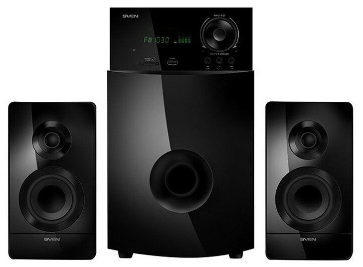 Колонки Sven MS-2100 2.1, мощность (RMS): 50Вт + 2х15Вт, SD/USB, FM-радио, VFD-дисплей, пульт ДУ