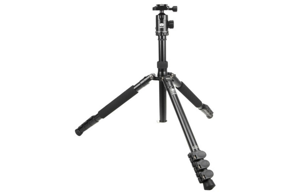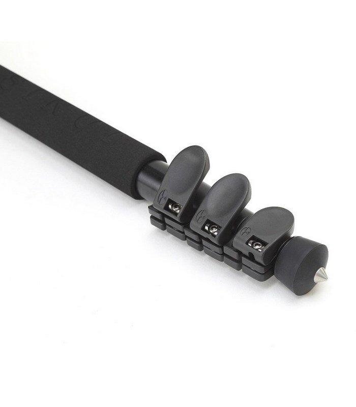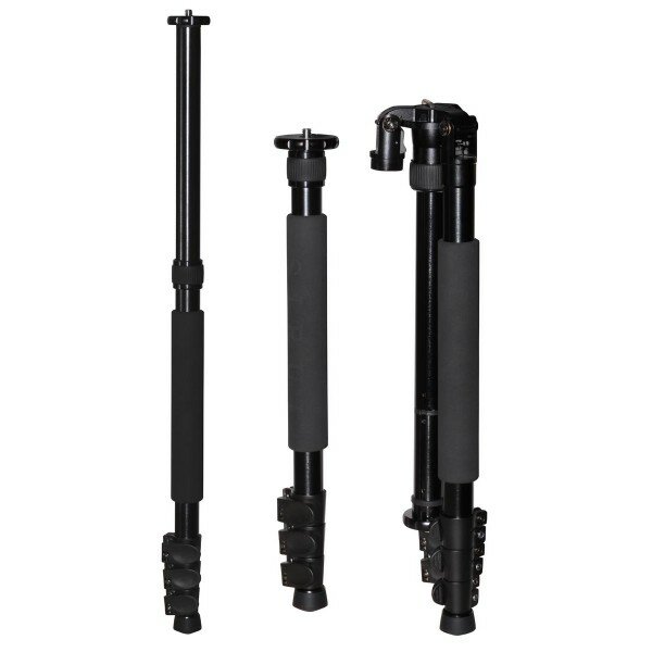 Ноги раскрываются на 180 градусов, есть три фиксируемые положения. Сменная шаровая головка, съемная площадка с винтом 1/4 дюйма под гнездо фотоаппарата. Две сменные объединяемые центральные штанги (большая и малая), максимальная высота с двумя штангами примерно 1.75м. Удобная сумка-переноска с китом (два шестигранника) для конфигурирования. Очень компактен в сложенном виде. |