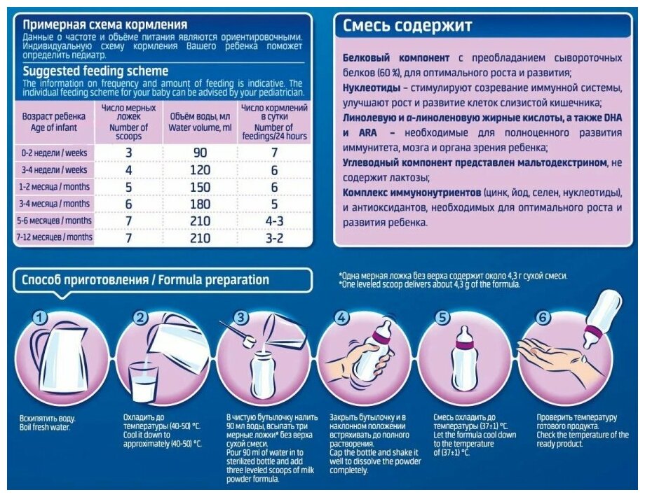 | Состав | молоко коровье обезжиренное, мальтодекстрин, растительные масла (пальмовый олеин, рапсовое, кукурузное, кокосовое), концентрат… сывороточных белков, масло, содержащее докозагексагеновую кислоту ОНА (рафинированный рыбий жир, смесь токоферолов, аскорбил пальмитат); масло, содержащее арахидоновую кислоту (ARA); минеральные вещества; витаминный премикс; витаминно-аминокислотный премикс: инозит, L-карнитин, холин, таурин; минеральный премикс; нуклеотидный премикс: цитидин-5"-монофост, уридин-5"-монофосфат, гуанозин-5"-монофосфат, аденозин-5"-монофосфат, инозин-5"-монофосфат с использованием ферментного препарата ещёскрыть |