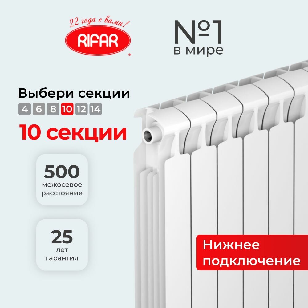 Радиатор биметаллический RIFAR MONOLIT Ventil 500 10 секций нижнее левое подключение