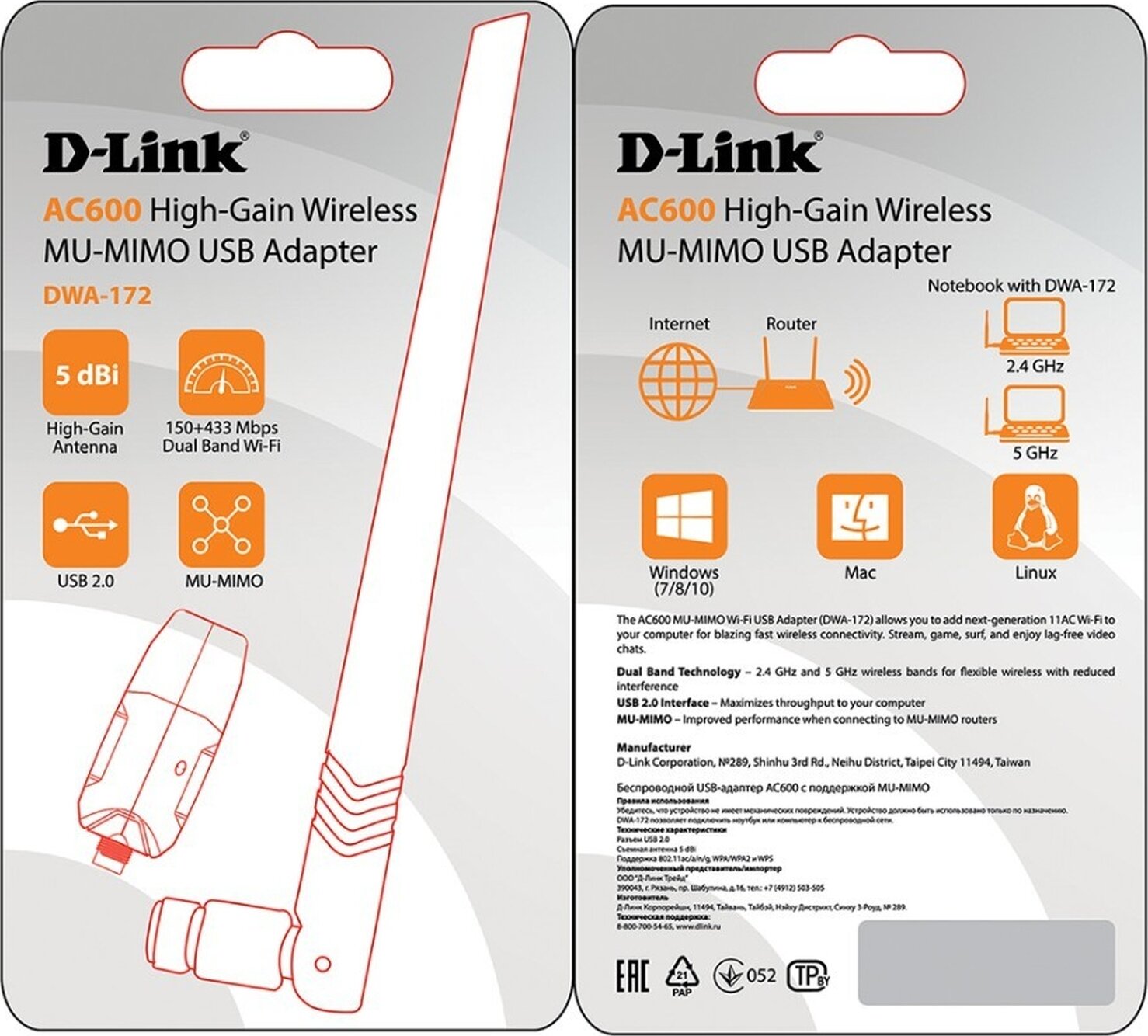 Wi-Fi адаптер D-Link DWA-172 DWA-172/RU/B1A USB 2.0 среда передачи данных Wi-Fi 433Mbps 2.4 GHz,5.0 GHz GHz 802.11a,802.11ac,802.11b,802.11g,802.11n