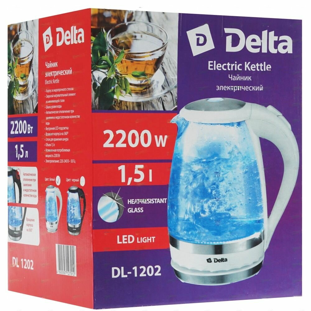 Купить Электрочайник DELTA DL-1202, корпус из жаропр. стекла, белый: 2200 Вт, объем 1,5 литра