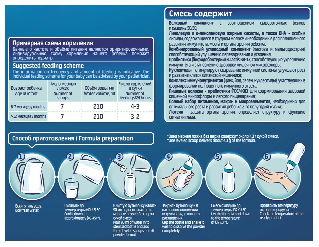 | Состав | молоко коровье обезжиренное; растительные масла: пальмовый олеин, рапсовое, кукурузное, кокосовое; молочный сахар; мальтодекстрин;… сыворотка деминерализованная; концентрат сывороточных белков; пребиотики: олигофруктоза (ФОС), олигогалактоза (ГОС); масло, содержащее докозагексаеновую кислоту (DHA) (рафинированный рыбий жир, смесь токоферолов, аскорбил пальмитат); масло, содержащее арахидоновую кислоту (ARA); минеральные вещества; витаминный премикс; витаминно-аминокислотный премикс: холин, инозит, L- карнитин, лютеин; нуклеотидный премикс: цитидин-5-моносфосфат, уридин-5-монофосфат, гуанозин-5-монофосфат, аденозин-5-монофосфат, инозин-5-монофосфат; бактериальный концентрат бифидобактерий Bifidobacterium lactis BB-12 ещёскрыть |