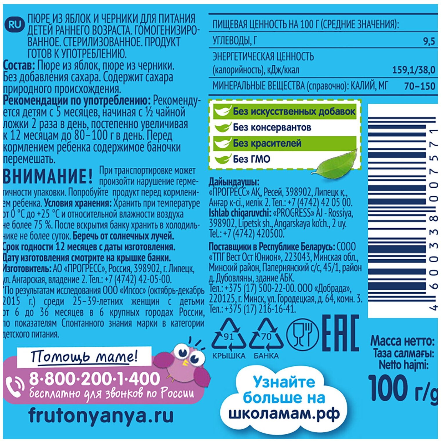 Пюре ФрутоНяня яблоко и черника, с 5 месяцев, 100 г, 12 шт.