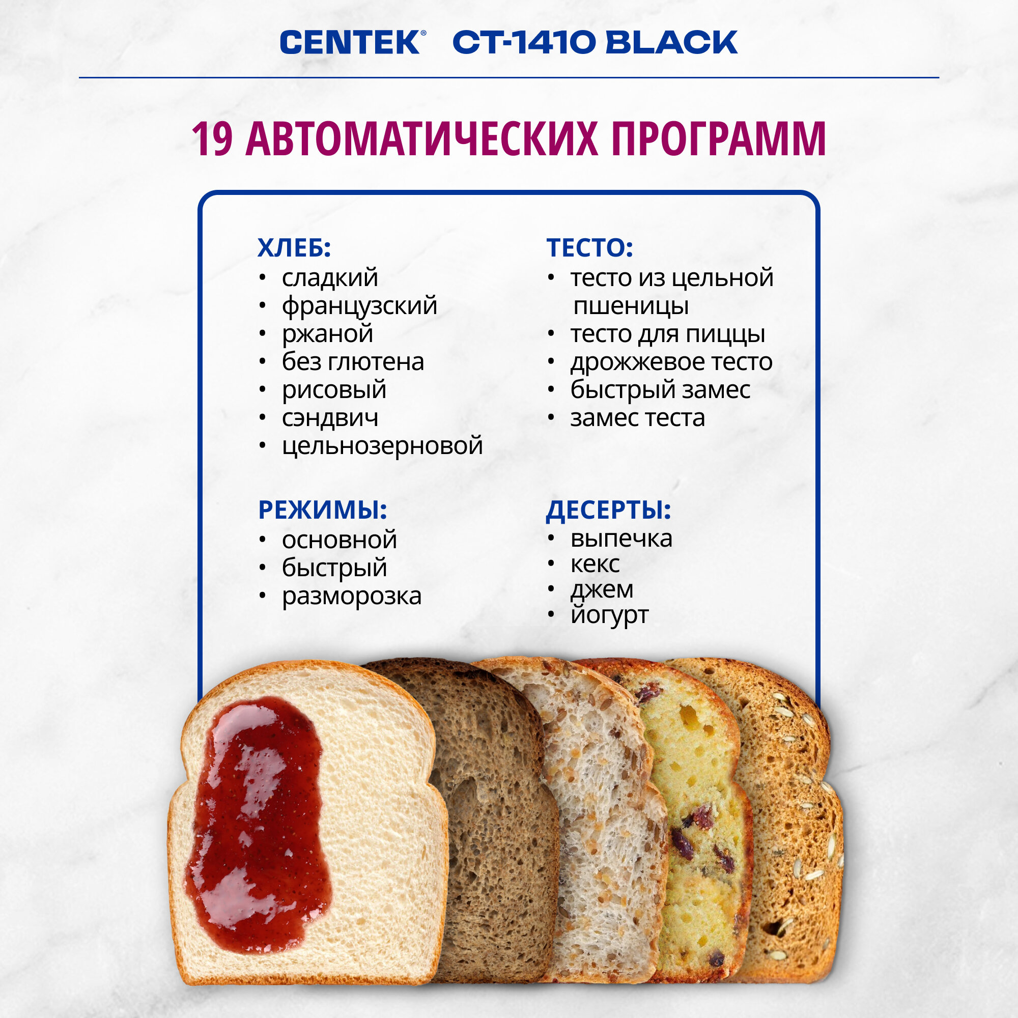 Хлебопечка Centek CT-1410 /650Вт, 750г, 19 программ интересное:
