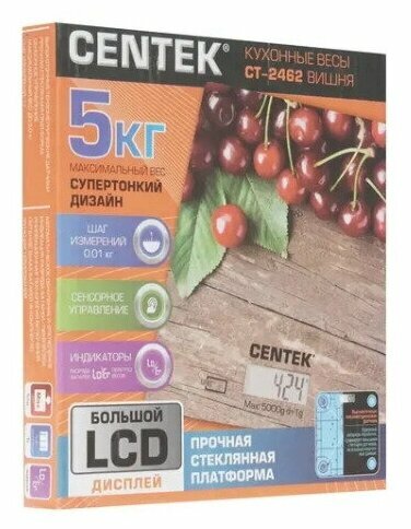 Весы Кухонные Centek Ct-2462 (Вишня) Стеклянные, Электронные, Max 5Кг, Шаг 1Г, Шелкография, Lcd CENTEK арт. CT2462CHERRY