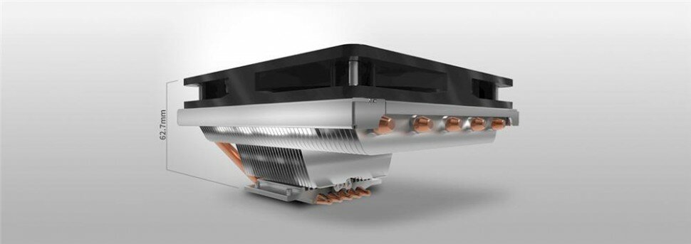 Оперативная память с радиаторами под него не влезет, т.к. кулер частично перекрывает слоты, а сам довольно невысокий. Теплосъемная площадка организована таким образом, что трубки прилегают непосредственно к крышке процессора и она неровная. |