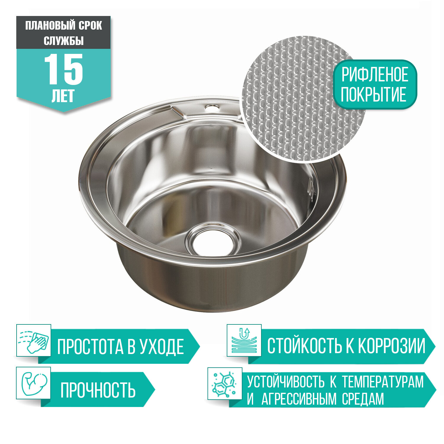 Врезная кухонная мойка Mixline из нержавеющей стали рифленая круглая d 51 см выпуск 3 1/2 глубина 18 см