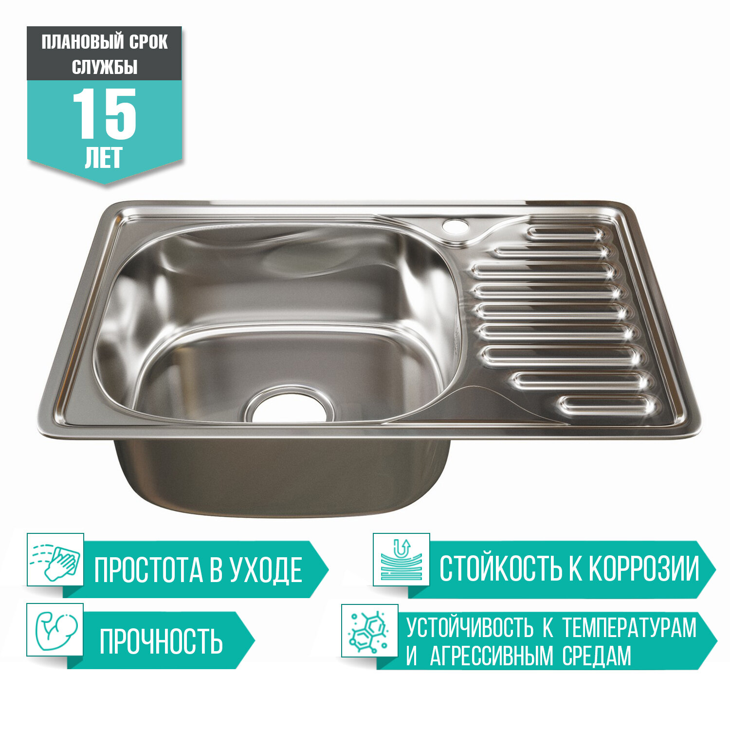 Врезная кухонная мойка Mixline из нержавеющей стали, Прямоугольная 42х66 см выпуск 3 1/2 16 см, крыло правое