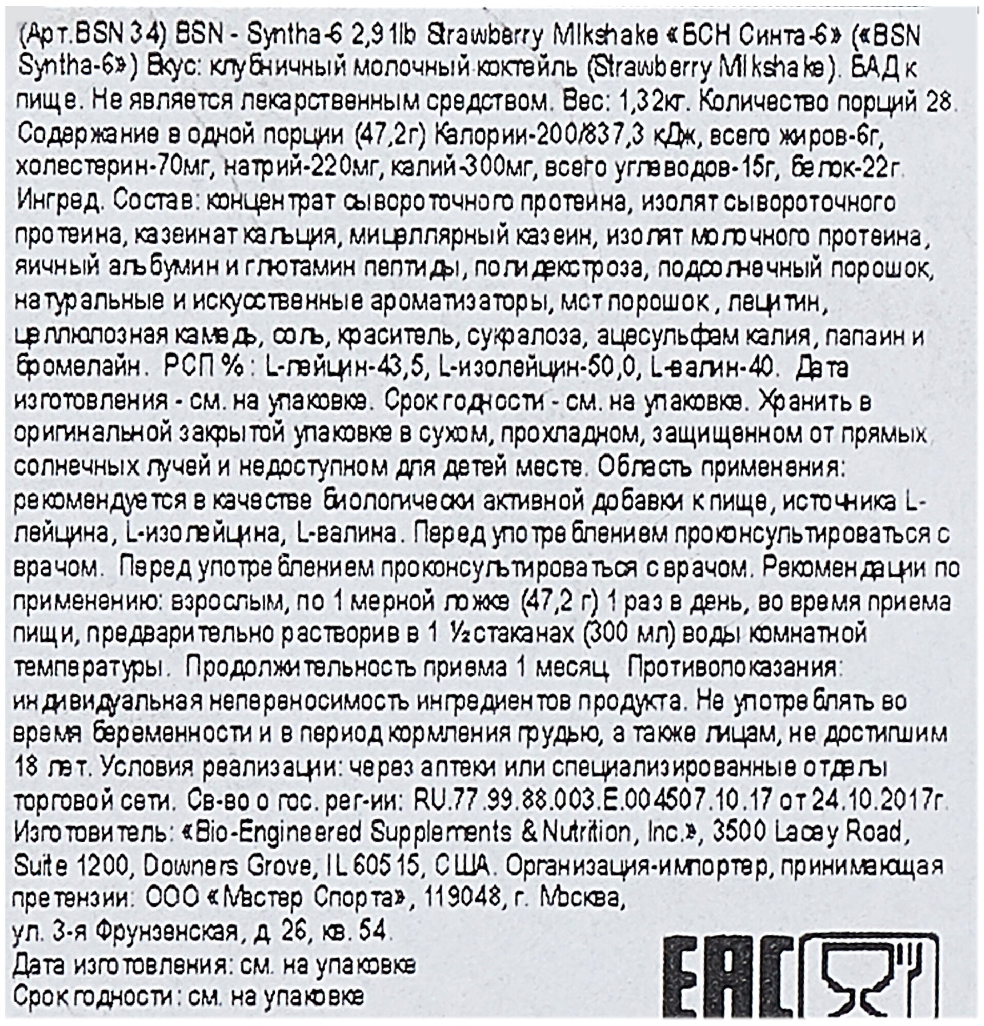 BSN Syntha-6 1320 гр. 2.91lb (BSN) Клубничный молочный коктейль