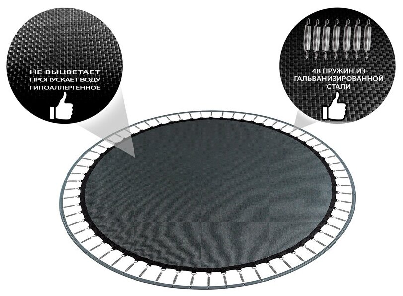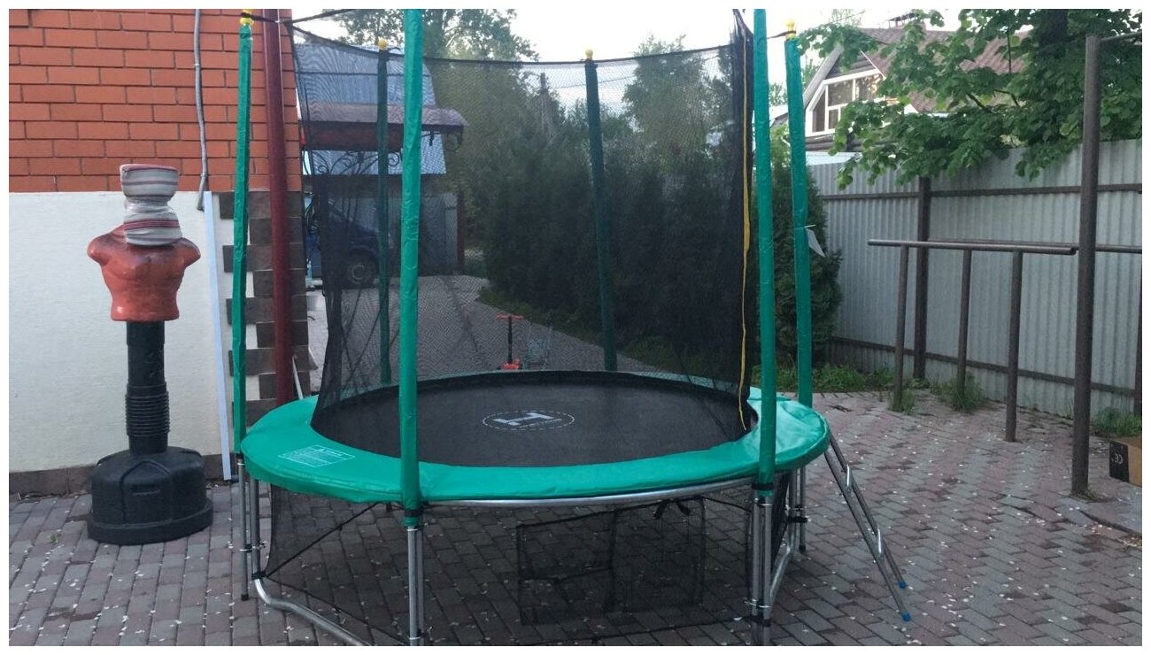 Конструкция у батута добротная, все составляющие выполнены качественно, никаких недочетов нет. В комплектации есть все,что нужно для сборки, подробная понятная инструкция. Ограждение- сетка имеет вход/ выход на замочке, ребенок с легкостью сам может открыть и закрыть. Дно выполнено из плотного материала. Стоит батут устойчиво, за безопасность отдельное спасибо. Для нас это просто незаменимая вещь на даче, однозначно советую к покупке. |