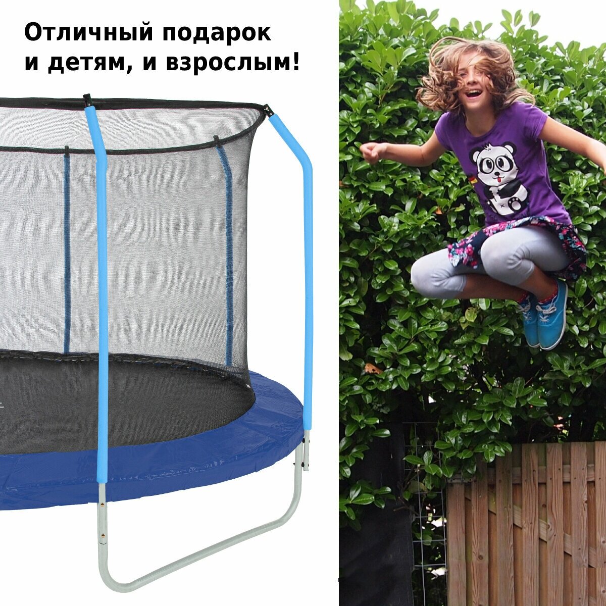 | Минусы: | В комплект положили защитную сетку меньшего диаметра,чем сам батут |