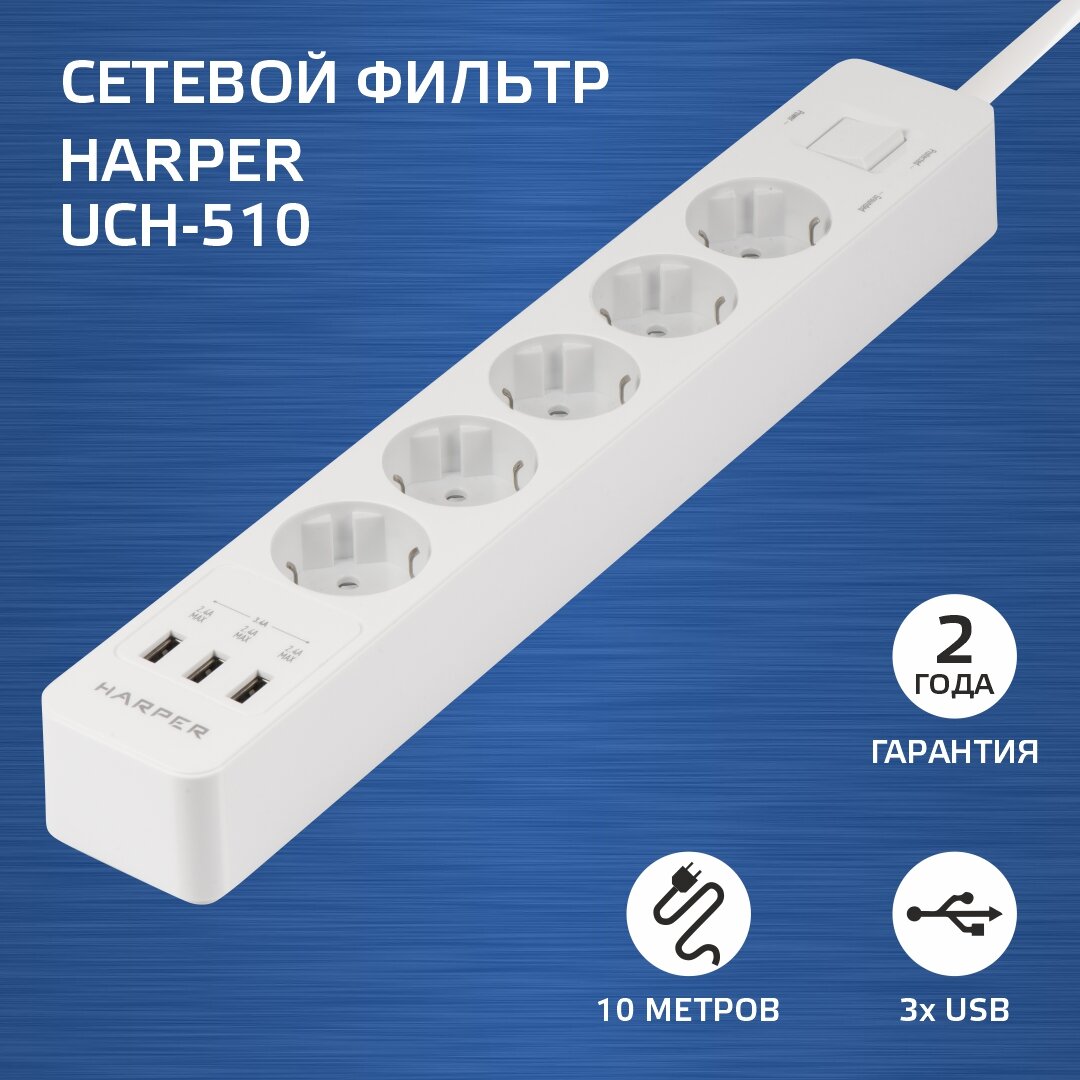 Сетевой фильтр HARPER UCH-510, 5 розеток, 10 м, с/з, 16А / 4000 Вт, белый