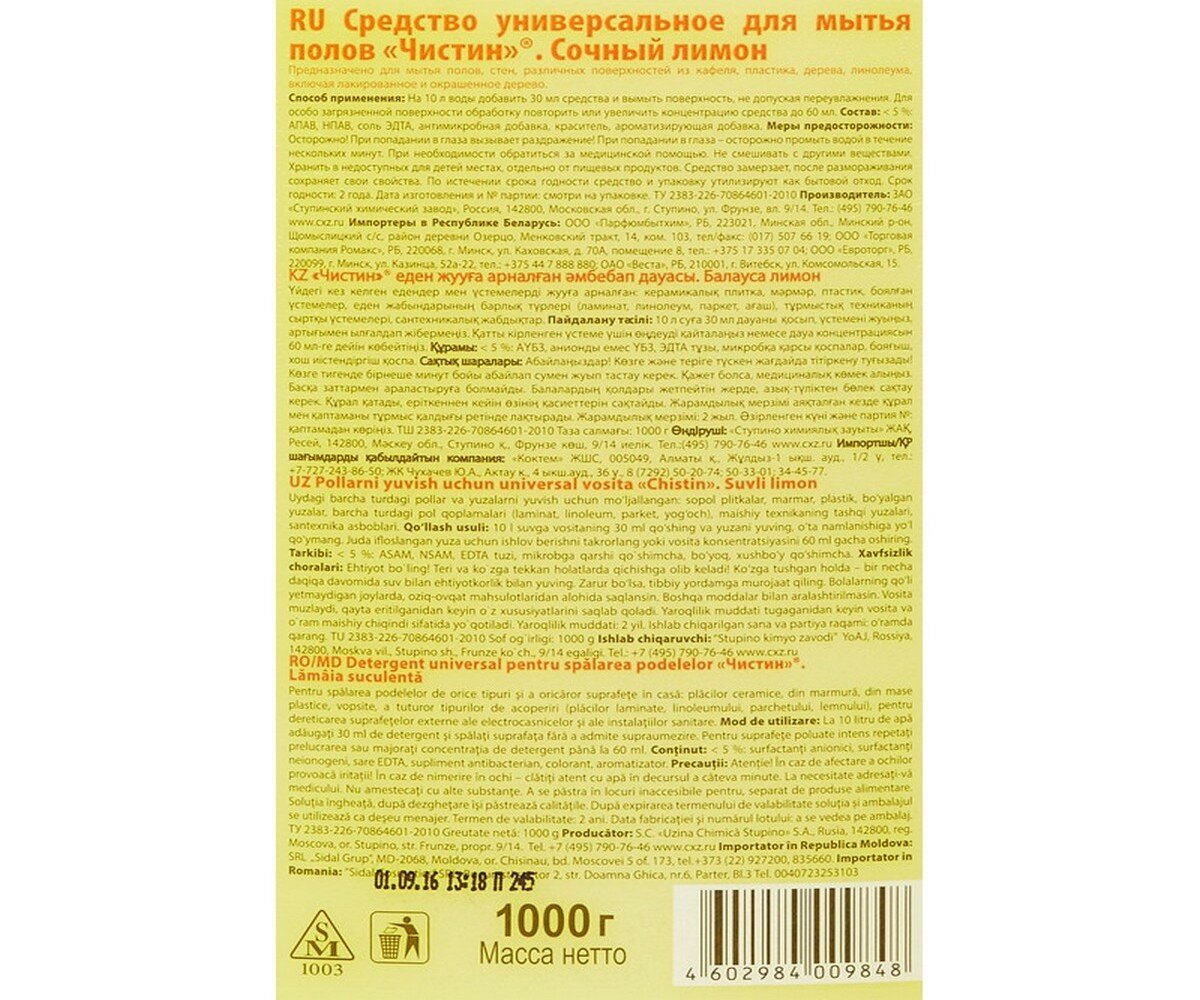 Ниже Вы можете прочитать отзывы на Ступинский химический завод (СХЗ) Средство для мытья пола Чистин Сочный лимон 1000 мл, ознакомится с подробными характеристиками, посмотреть интересные обзоры и фотографии на Ступинский химический завод (СХЗ) Средство для мытья пола Чистин Сочный лимон 1000 мл.