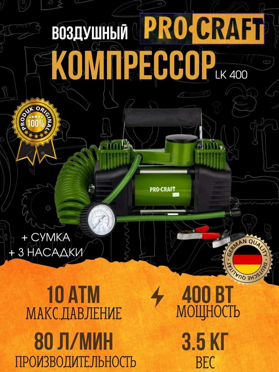 Компрессор воздушный автомобильный для шин Procraft LK400, 10 атмосфер, 80л/мин, 400Вт интересное: