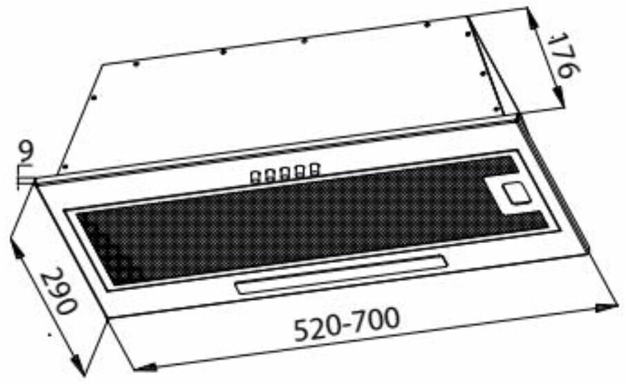 Встраиваемая вытяжка, полновстраиваемая в шкаф, 60 см, отвод/циркуляция, механический контроль, 3 скорости работы, производительность 860 м3/ч, LED освещение, металл, черный, 520х290х176 мм.
