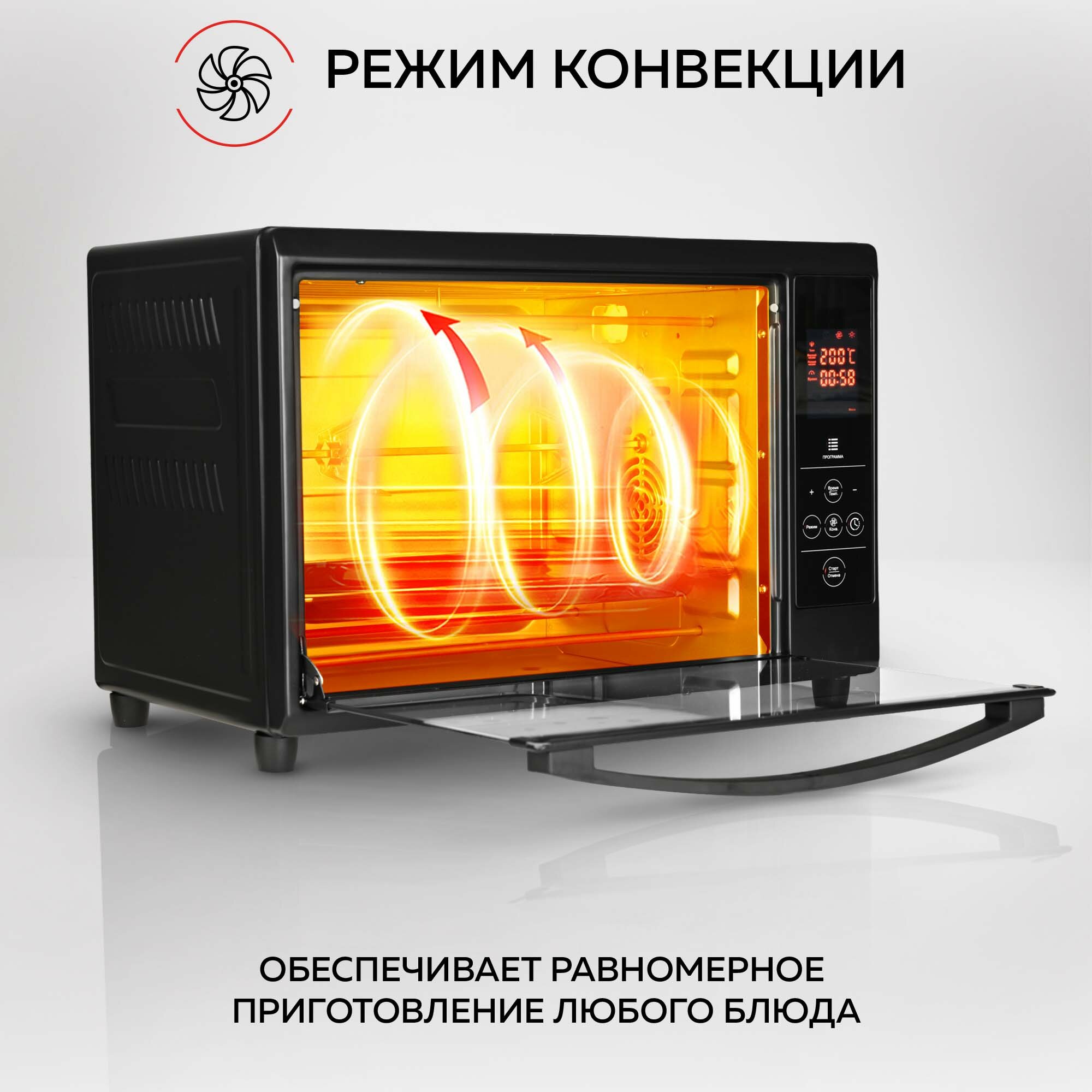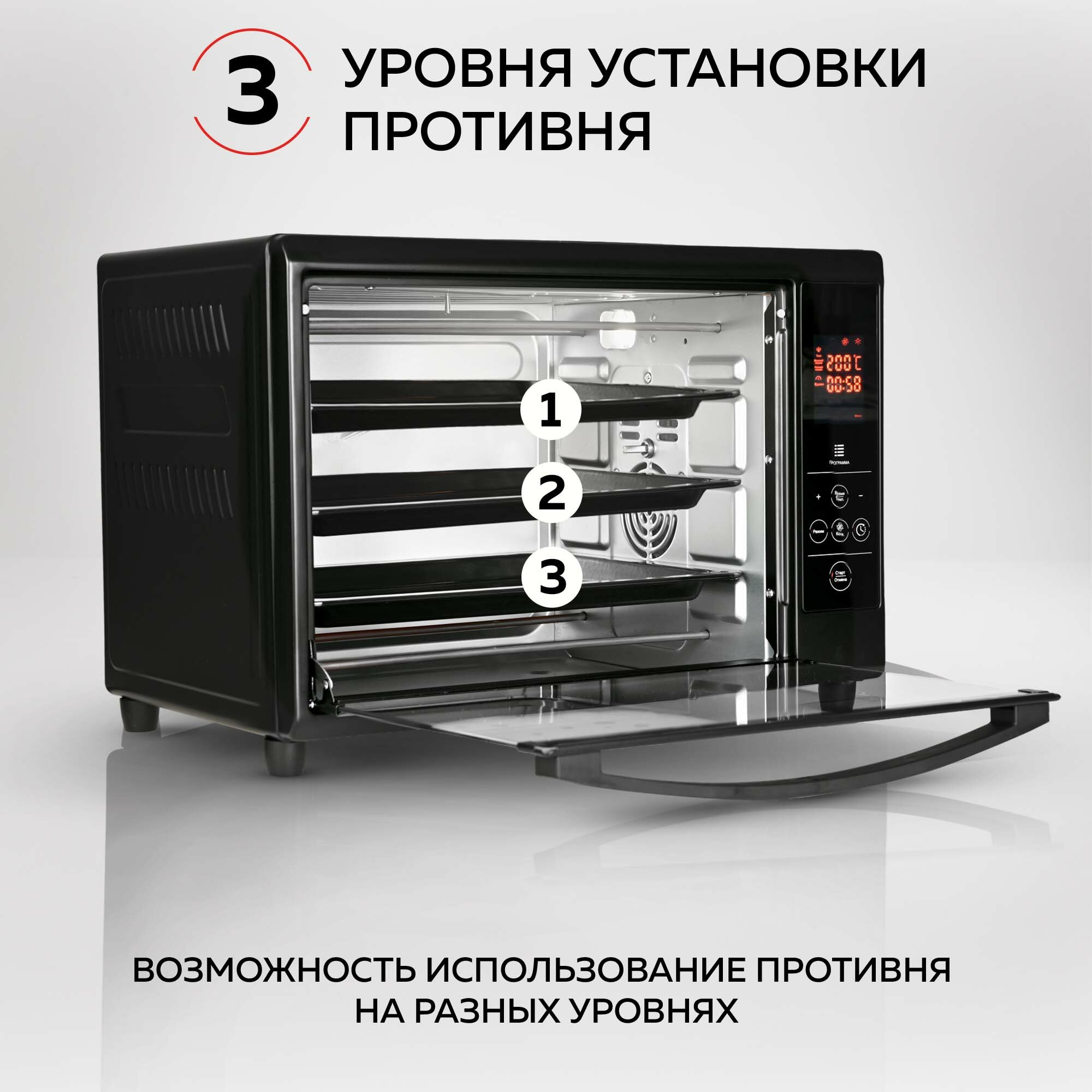 Разогревается быстро, есть подсветка, работает всё время приготовления, что очень удобно. Есть все нужные режимы и программы приготовления.