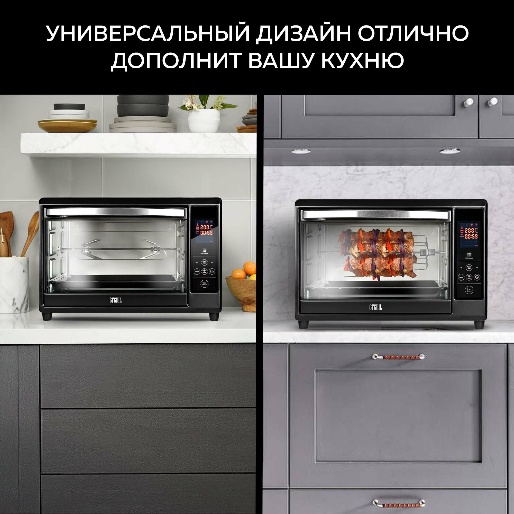 Удобная печь, много функций настройки, по габаритам на гриль спокойно помещается курочка среднего размера, мы очень довольны