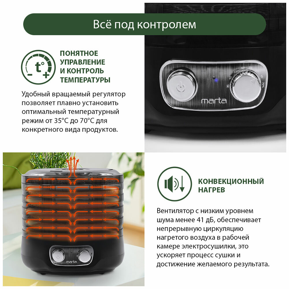 Сушилка MARTA MFD-2052PS 7 поддонов-5+2 для пастилы темный обсидиан д/фруктов,овощей