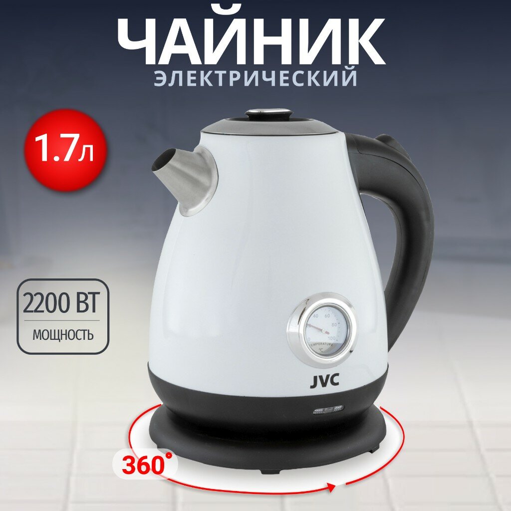 Чайник электрический JVC 1.7 л с датчиком температуры нагрева, ретро-дизайн, подставка с вращением на 360 градусов, 2200 Вт
