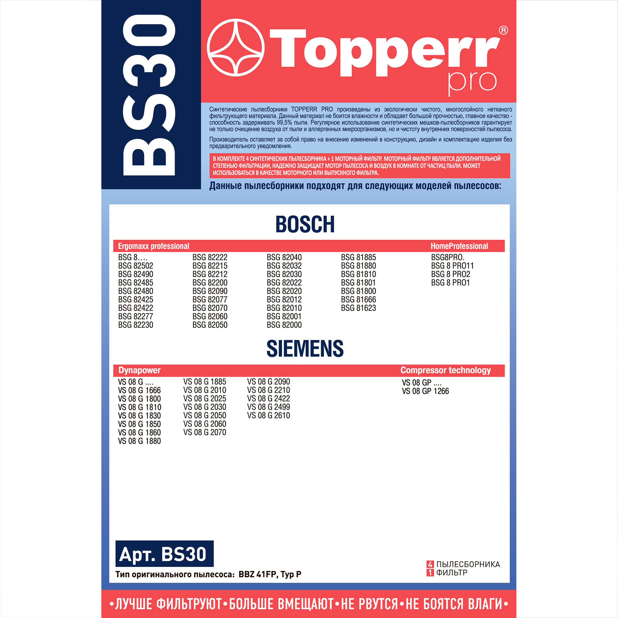 Купить Синтетические пылесборники BS30 для пылесосов BOSCH и SIEMENS TOPPERR 1402/BS30