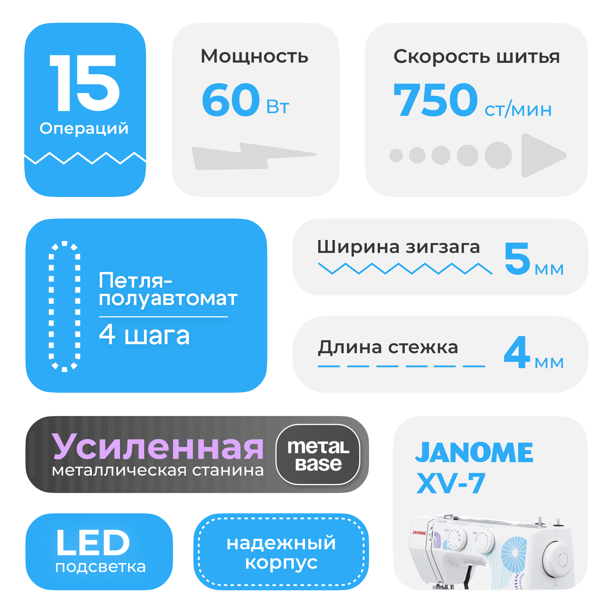 Ниже Вы можете прочитать отзывы на Швейная машина Janome XV-7, ознакомится с подробными характеристиками, посмотреть интересные обзоры и фотографии на Швейная машина Janome XV-7.