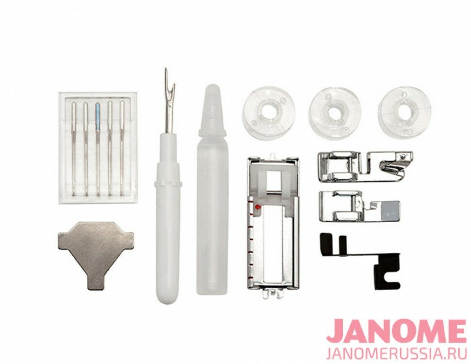 | Комплектация | Универсальная лапка A Лапка для вшивания молнии односторонняя Лапка подрубатель на 2 мм D Рамка для полуавтоматической петли Направитель для потайного шва Шпульки пластиковые 4шт. (3шт. и 1 в машине) Набор игл Organ — 5 шт. Вспарыватель Отвёртка-ключ Маслёнка с маслом Жесткий чехол |