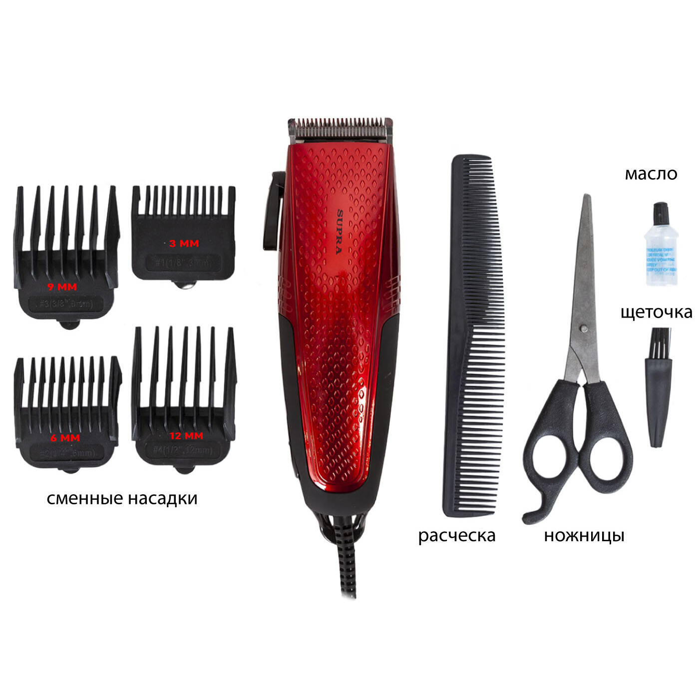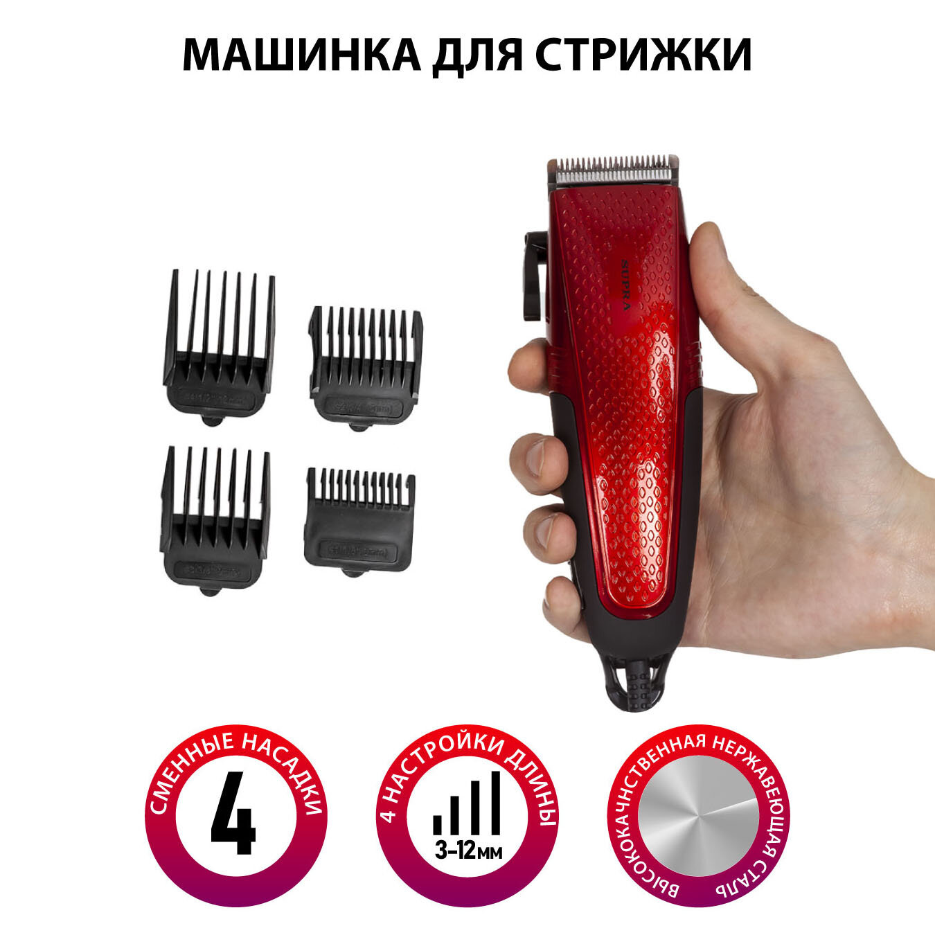 Машинка для стрижки Supra HCS-775 красный 12Вт (насадок в компл:4шт)
