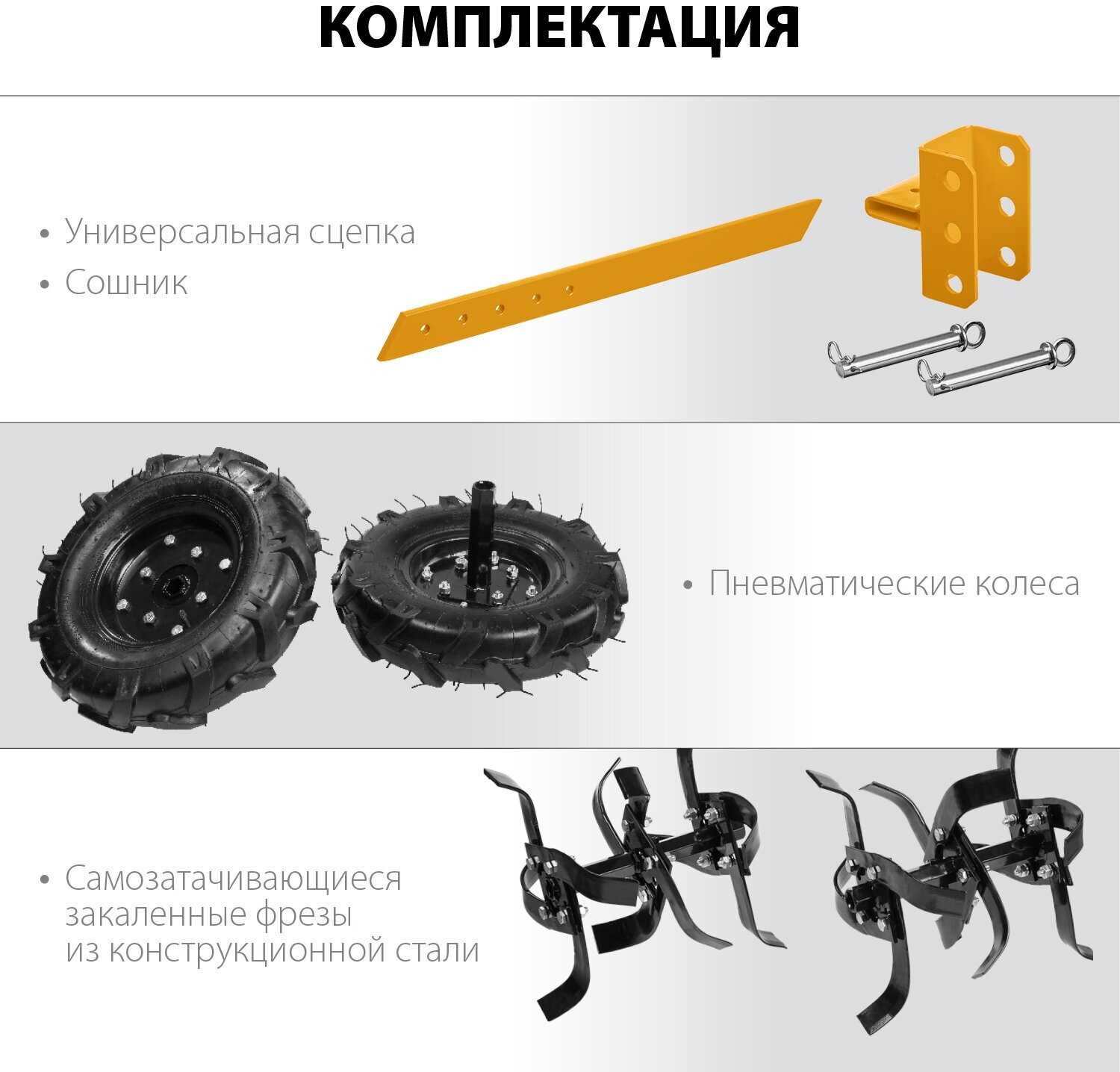 | Комплект поставки | мотоблок, крыло защитное левое, крыло защитное правое, передняя соединительная планка крыльев, задняя соединительная планка крыльев, ось крепления фрезы 2 шт., фреза левая 9 шт., фреза правая 9 шт., ось для колеса 2 шт., рычаг переключения передач, колесо 4.00-8 2 шт., сошник 1 компл., сцепка сошника, комплект крепежа, комплект ключей, инструкции по безопасности, руководство по эксплуатации |