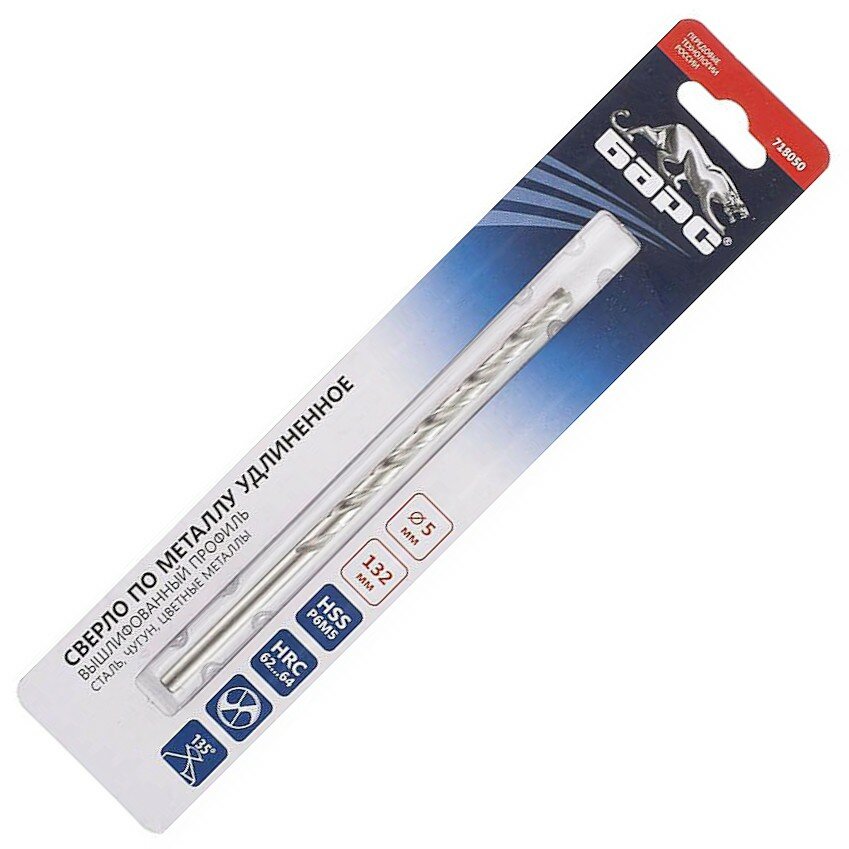 Сверло по металлу Барс 718050, 5 x 132 мм, Р6М5, удлиненное