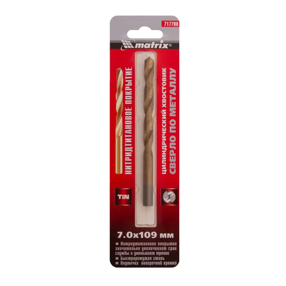Сверло по металлу MATRIX 717700, 7 мм, HSS, нитридтитановое покрытие, цилиндрический хвостовик