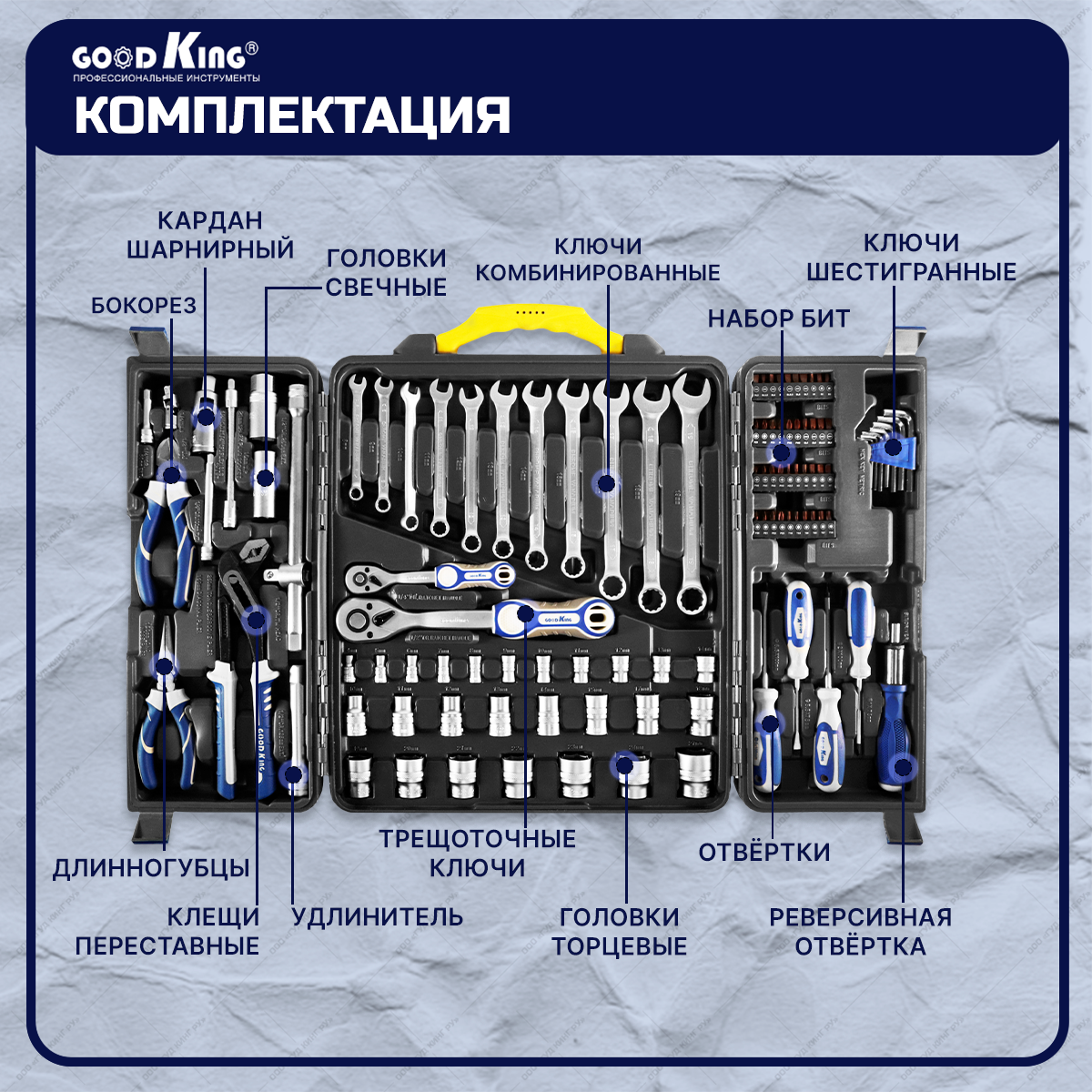 Набор инструментов Трещотка 1/4 1/2 110 предметов GOODKING M-10110 в кейсе, tools для дома, для автомобиля