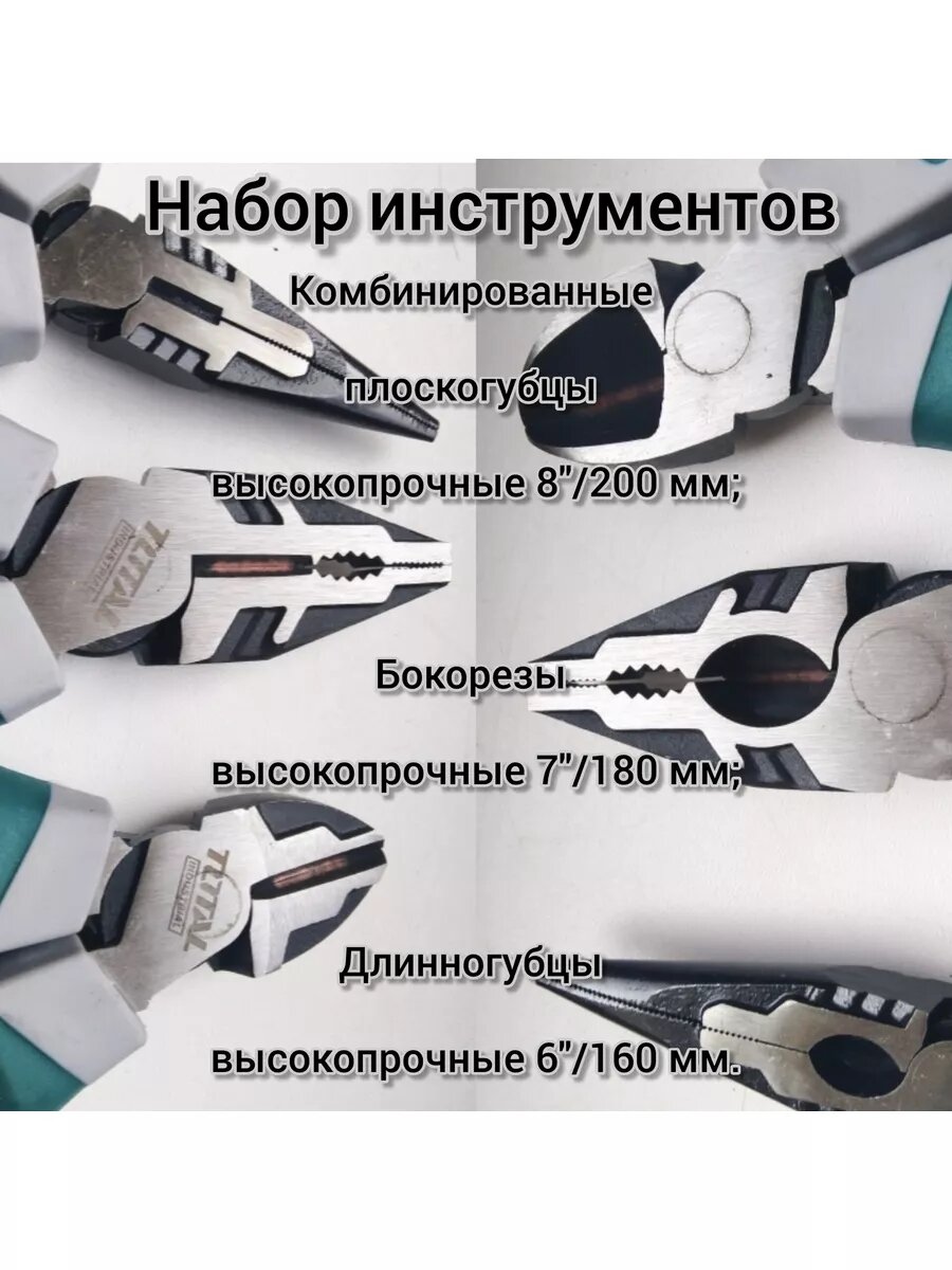 | Шарнирно-губцевый инструмент подробно | бокорезы 180 мм; длинногубцы 160 мм; плоскогубцы 200 мм |