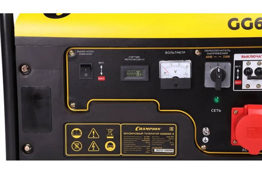 Генератор бензиновый CHAMPION GG6500-3, 6,2/ 6,8 кВА, 400/ 230В / 16А, трёхфазный, синхронный, ручной запуск