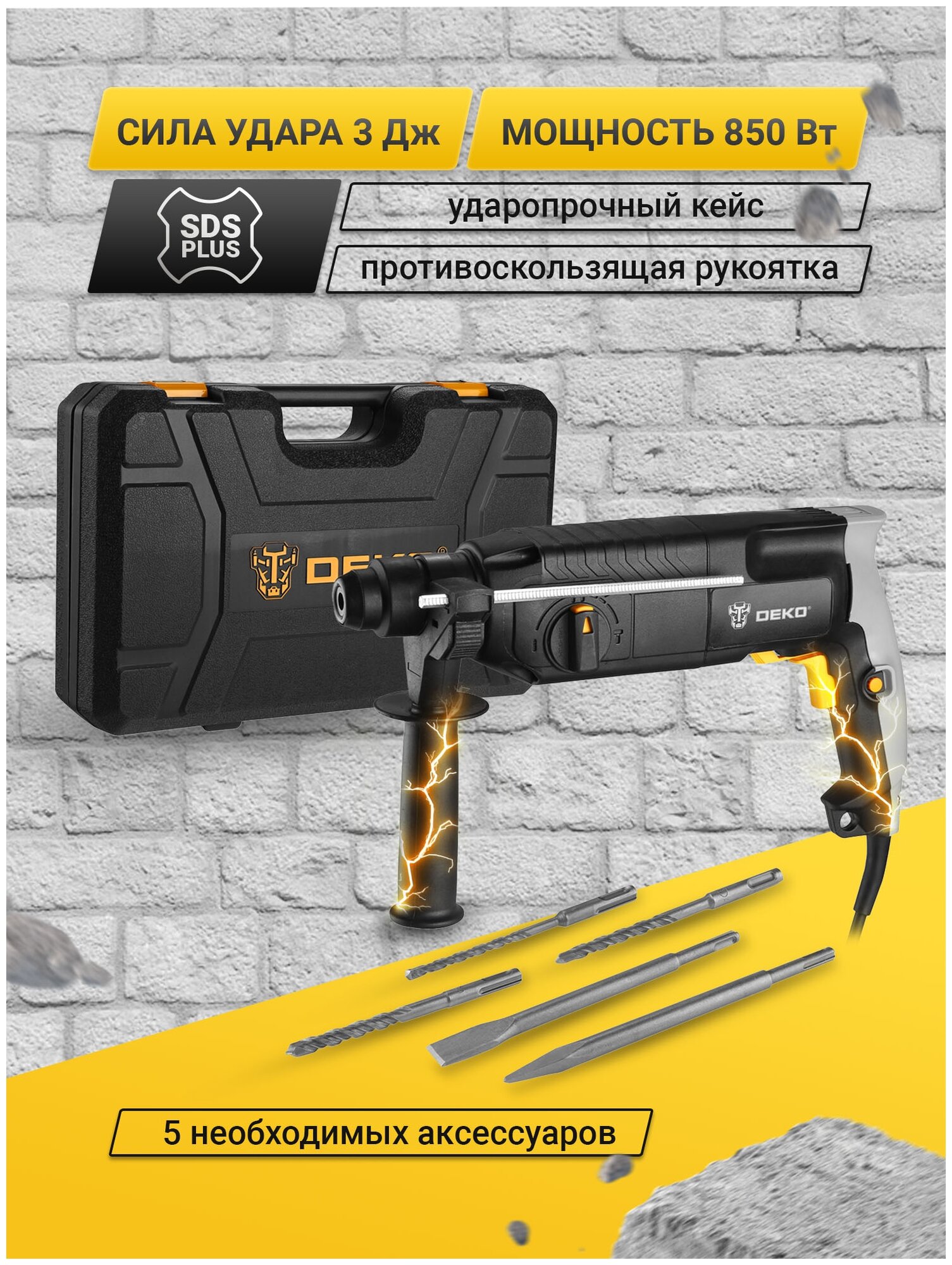 Перфоратор Deko Dkh850w в кейсе с набором из 5 буров SDS черно-желтый .