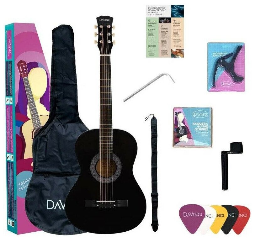 Купить DAVINCI DF-50A BK PACK - набор гитариста: акустика, чехол, медиатор, вертушка, ремень, каподастр, струны