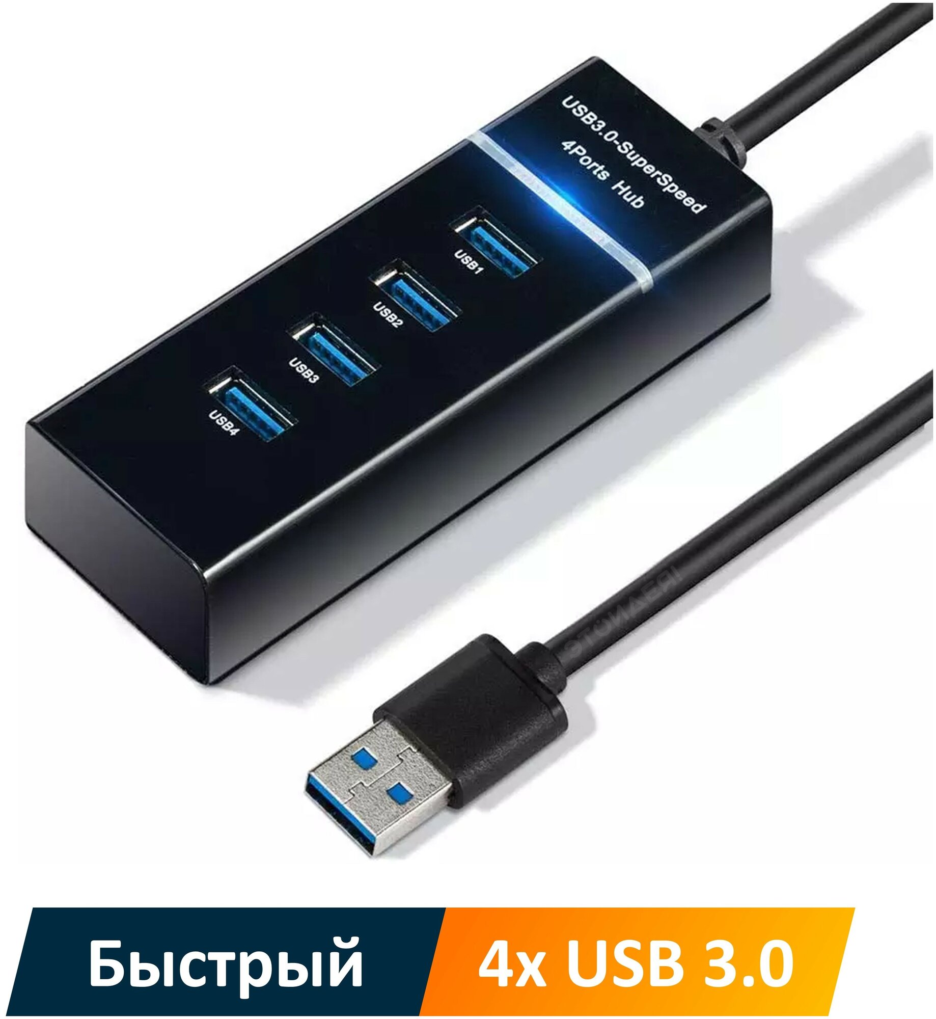 Купить USB хаб NOBUS на 4 порта USB 3.0, скорость 5 Гбит/с, черный пластик, синяя LED подсветка