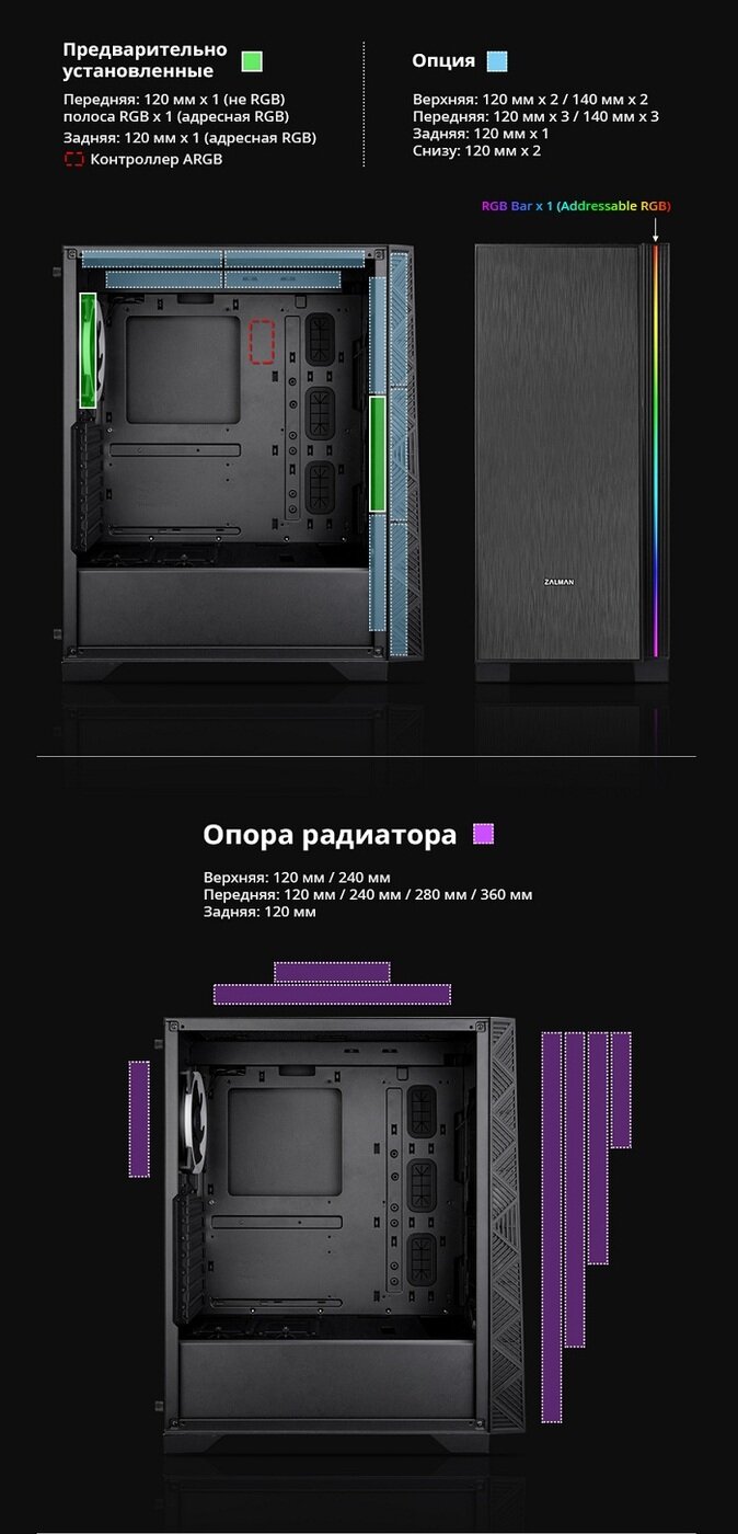 Контроллер управления подсветкой ргб Корзина под 3.5 жёсткий диск на защёлках Закалённое стекло Четыре посадочных места 2.5 ссд Кабель менеджмент с отпусками залман |