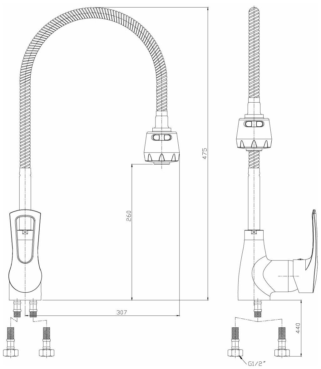 Смеситель для кухонной мойки с гибким изливом, 2 режима, подводка 40см, хром (Rossinka)