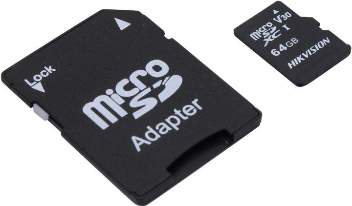 Карта памяти Hikvision microSDXC 64 ГБ Class 10, V30, UHS-I U1, R/W 92/10 МБ/с, адаптер на SD, 1 шт., черный