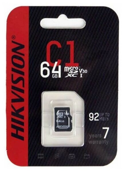 Карта памяти microSDXC UHS-I U1 Hikvision 64 ГБ, 92 МБ/с, Class 10, HS-TF-C1(STD)/64G/ZAZ01X00/OD, 1 шт., переходник без адаптера