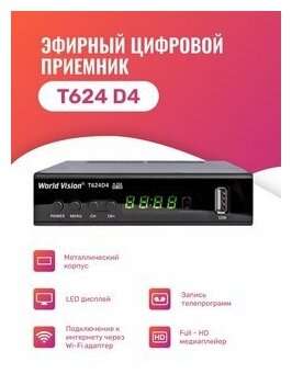 Ниже Вы можете прочитать отзывы на Цифровые ресиверы DVB-T2 World Vision Цифровой ресивер World Vision T624D4 (Эфирный, DVB-T2/C, HD, Dolby Digital), ознакомится с подробными характеристиками, посмотреть интересные обзоры и фотографии на Цифровые ресиверы DVB-T2 World Vision Цифровой ресивер World Vision T624D4 (Эфирный, DVB-T2/C, HD, Dolby Digital).