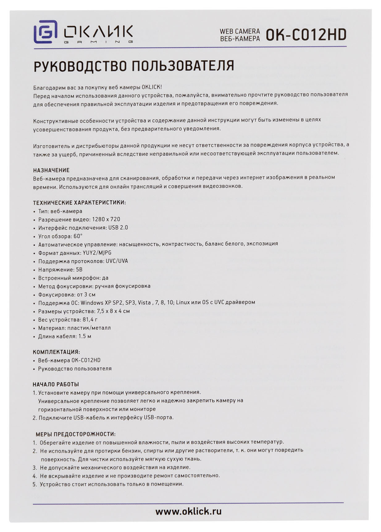 Веб-камера Oklick OK-C012HD интересное: