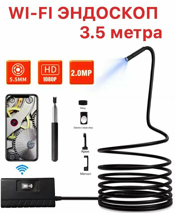 Купить Wi-Fi Эндоскоп 3.5 метра Full HD 1920x1080, 2 мегапикселя, с комплектом насадок и телескопической ручкой