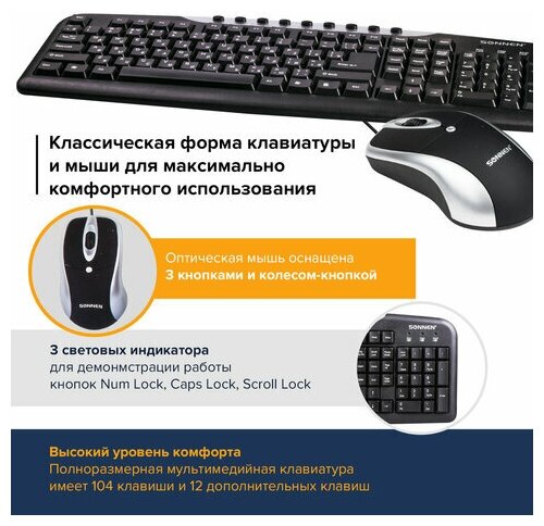 Купить Набор проводной SONNEN KB-S110, USB, клавиатура 116 клавиш, мышь 3 кнопки, 1000 dpi, черный/серебристый, 511284