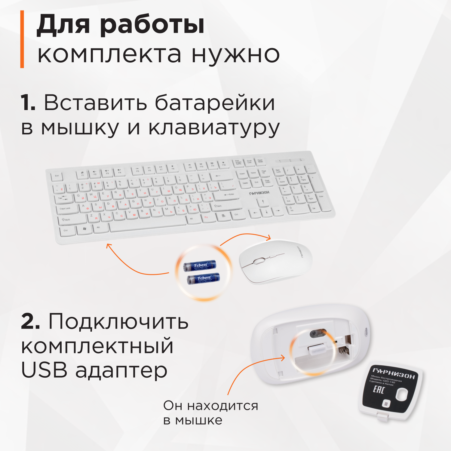 Клавиатура+мышь Гарнизон Gks-140, беспроводная, белый, 2.4 ГГц, 1600 Dpi, Usb, "nano" приемник