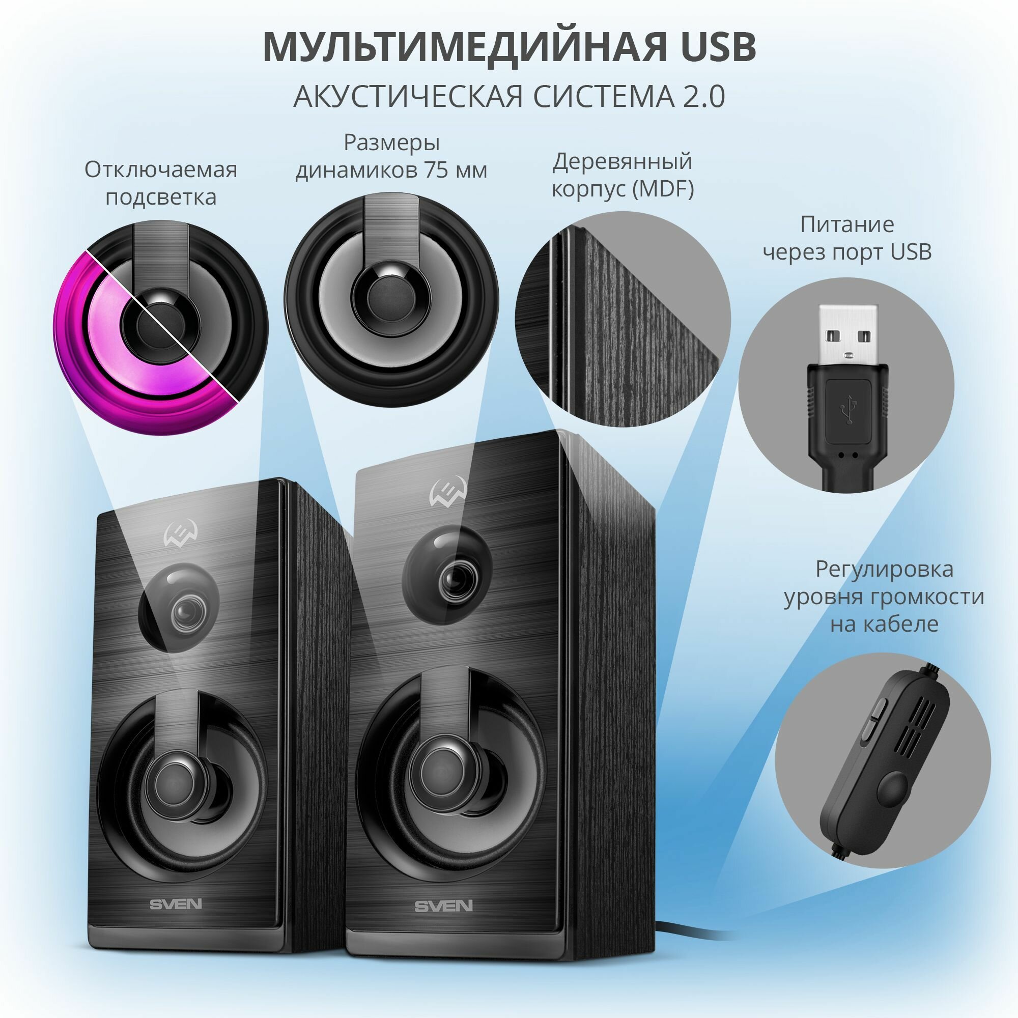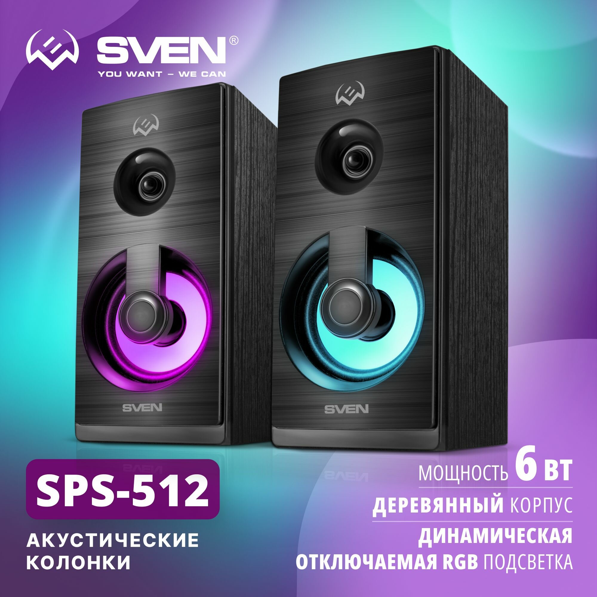 Колонки с USB питанием SVEN SPS-512 чёрные (2x3W, USB, RGB подсветка, дерево)