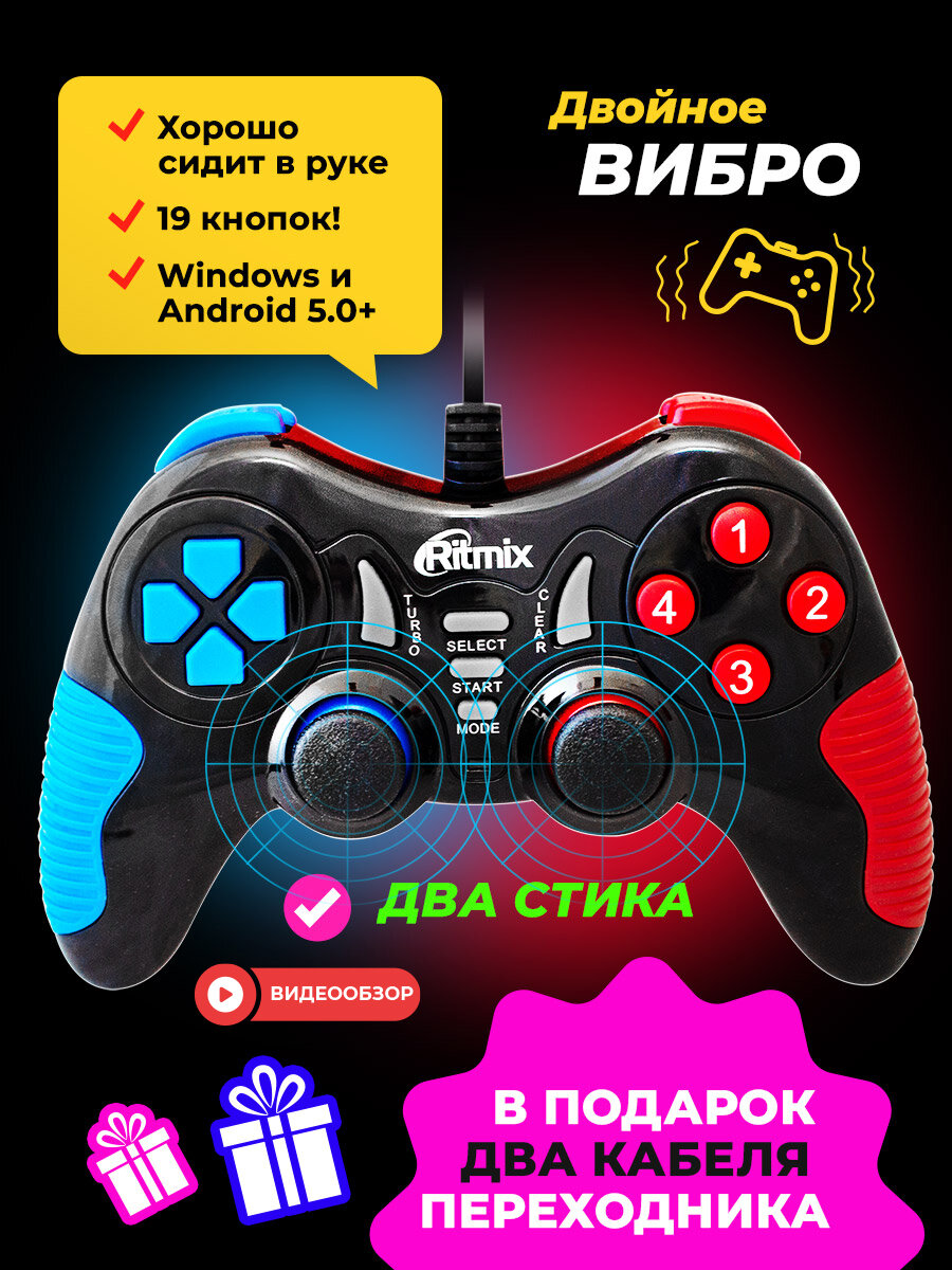 Геймпад RITMIX GP-013, 2мот.,ПК,ноут, Android,OS, USB 1.0/1.1/2.0, USB,Кол.кноп:17+2ан.дж,каб.150см