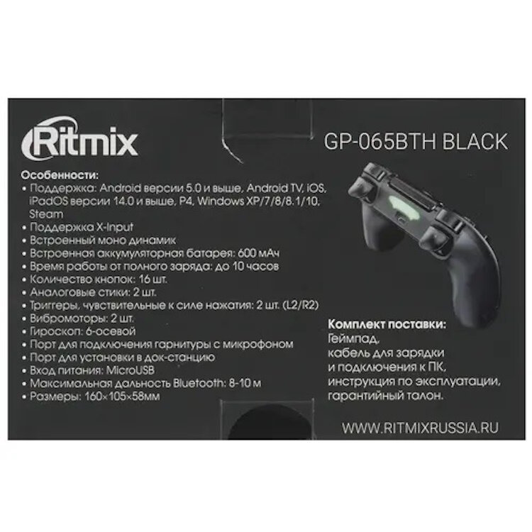 Геймпад RITMIX GP-065BTH Black,BTH,Подд.Android, OS , Перс.комп.и ноут.на Win,P4,Тач панель(работает,как мышь на AndroidOS),Аккум 600 мАч