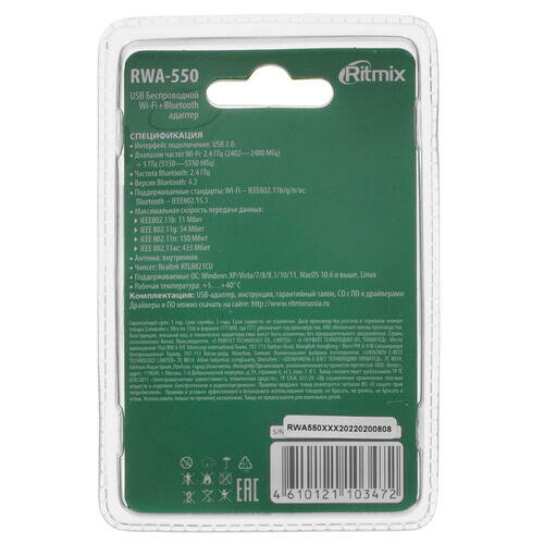 Ниже Вы можете прочитать отзывы на Адаптер WiFi + Bluetooth - USB Ritmix RWA-550 скорость до 433Мбит/с. Чипсет Realtek RTL8821CU. Внутренняя антенна, ознакомится с подробными характеристиками, посмотреть интересные обзоры и фотографии на Адаптер WiFi + Bluetooth - USB Ritmix RWA-550 скорость до 433Мбит/с. Чипсет Realtek RTL8821CU. Внутренняя антенна.